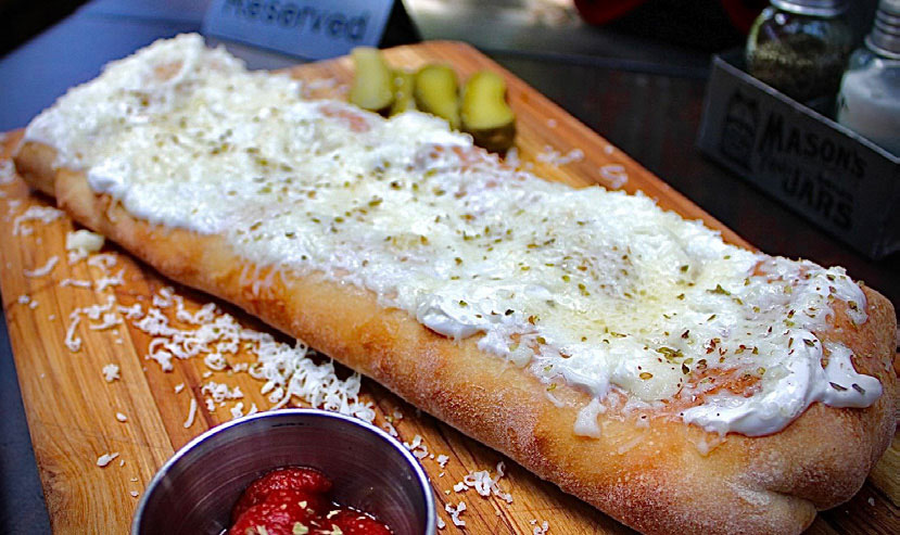 Topped with sour cream and provolone cheese served with tomato sauce and pickles